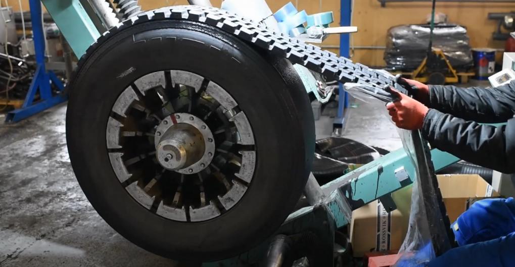 - Нанесение на шину протекторного слоя из ленточной сырой резины специальным агрегатом